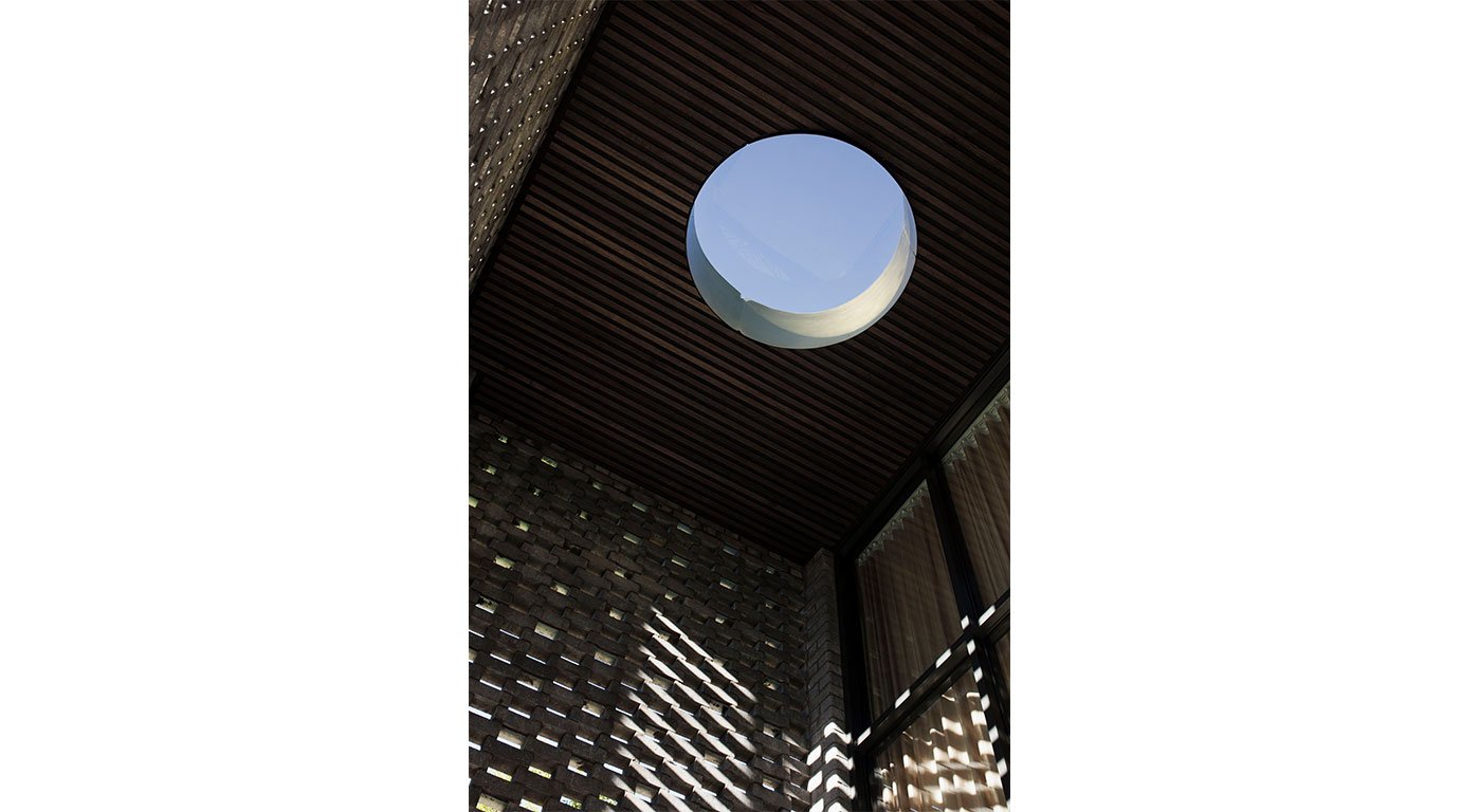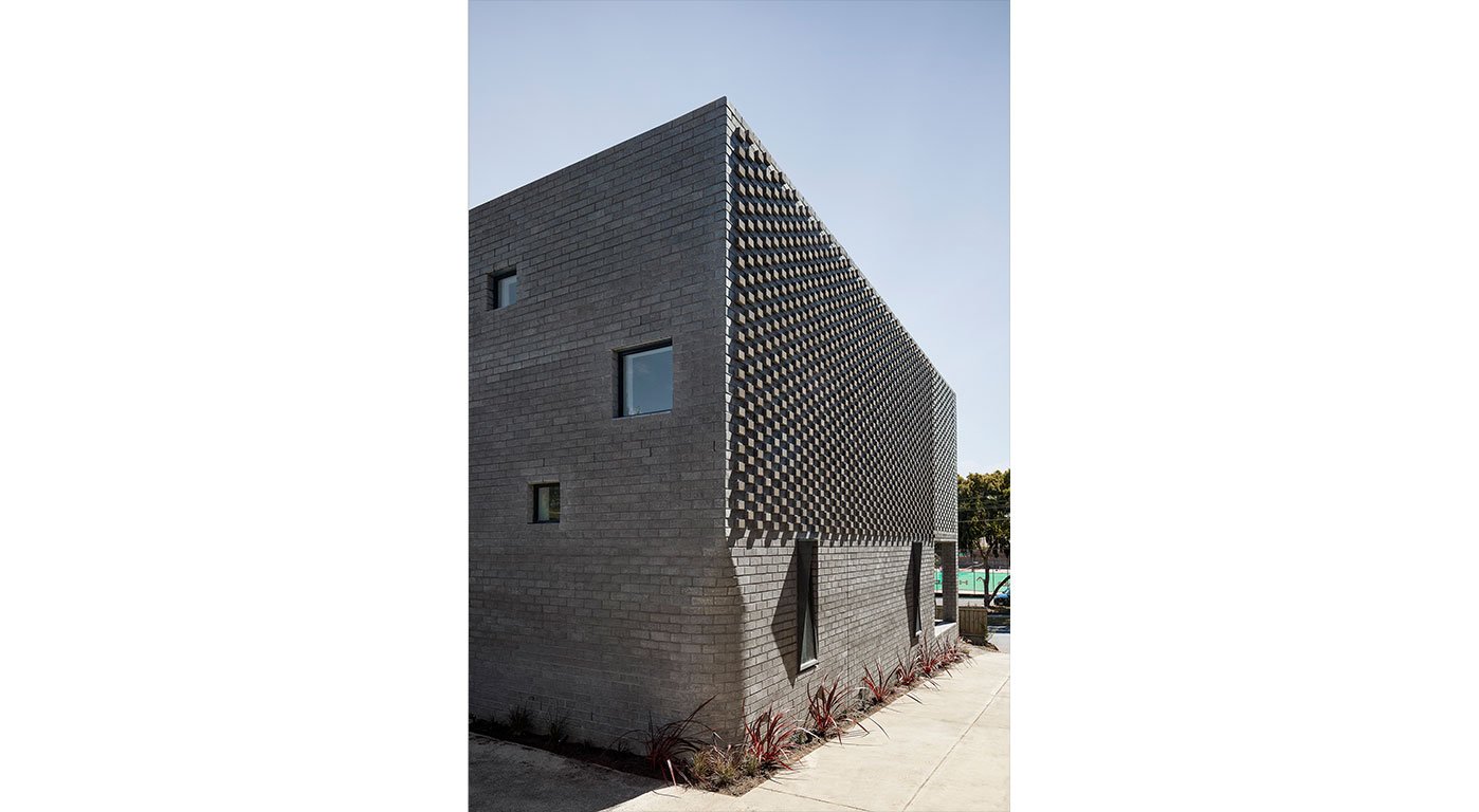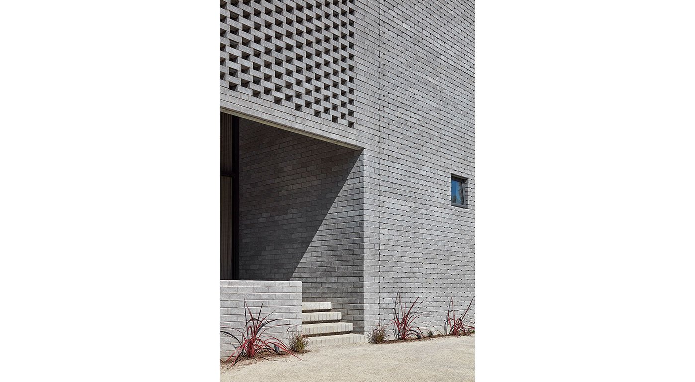 The building envelope reinforced the solidity of the volume punctured by openings and veranda. The corner of the cube is rounded and shaped to produce an illusion of mass, ironically achieved through the single-layer brick veneer envelope. This corner detail is applied to all window reveals, and in a larger gesture, an entire corner transits from a curve wall on the ground floor and corbelled out to meet the corner of the cube - like a medieval buttress to a castle. The west elevation is articulated with more intricate mitered bricks to create shadow and depth against the evening sun. The north elevation along the driveway consists of protruding bricks which cast shadow to produce texture along the elevation throughout the day. The envelope of the cube is an exercise in creating texture as ornament.