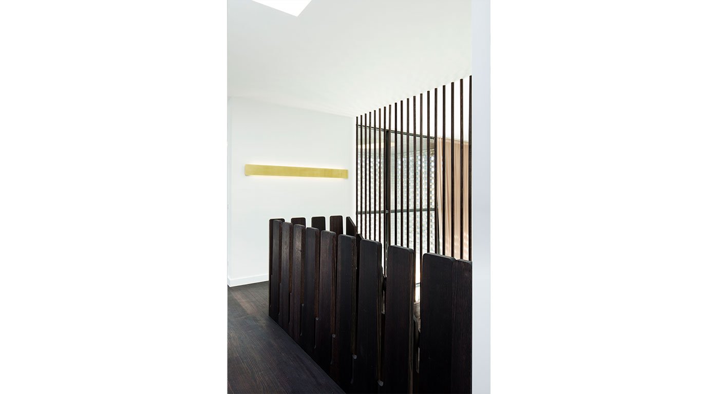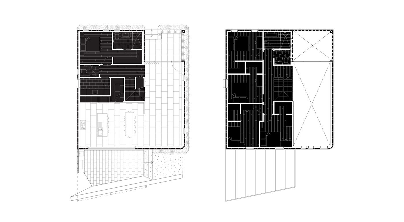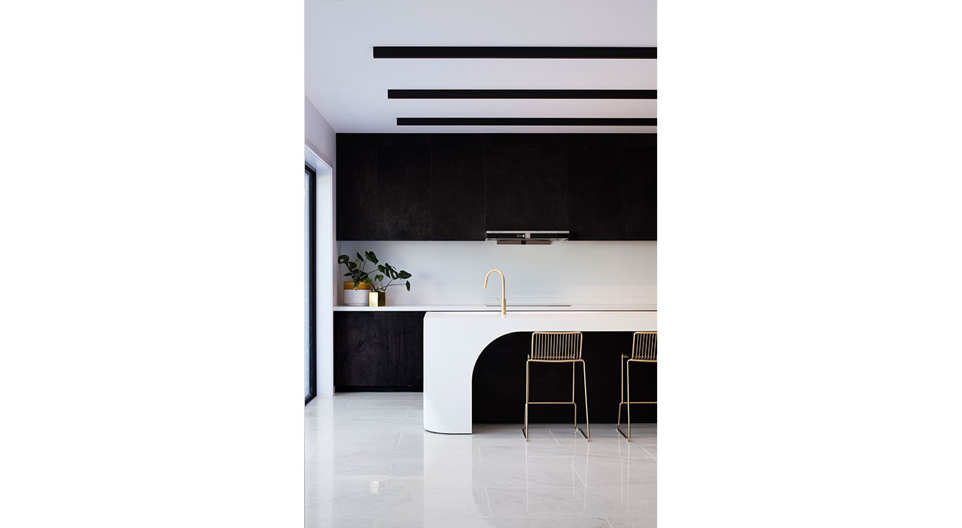 Like a Malevich painting, these elements are colour blocked in black and clad in brass against the flatness of the white walls. The colour black is used to mark all the private territory of the house - the bathrooms, utility and bedrooms. The kitchen and dining space with its striking black and white colour scheme form the functional heart of the house, which leads to the rear patio. A concrete retaining wall with integrated outdoor seating terraced the garden to negotiate the steep topography of the site – it also functions as a flood barrier to the dwelling.