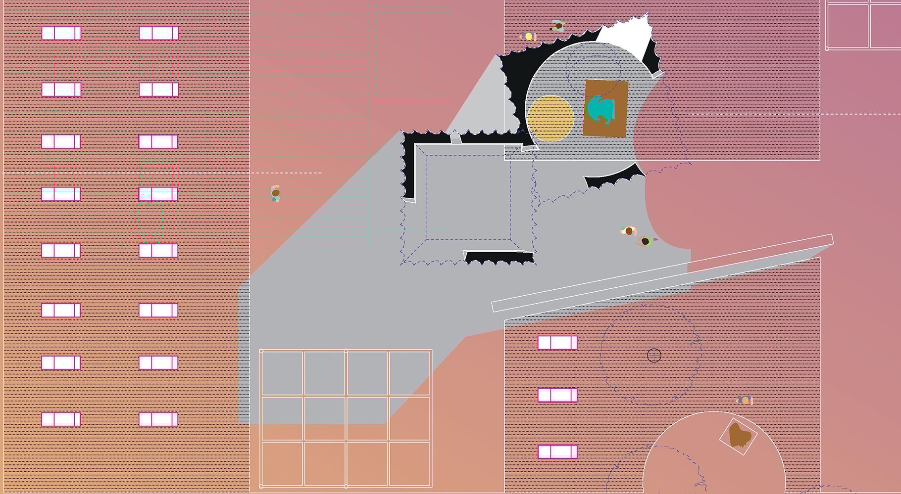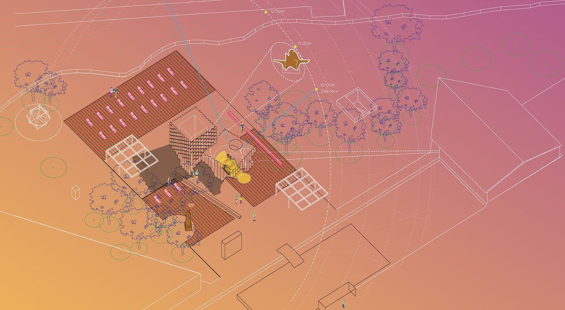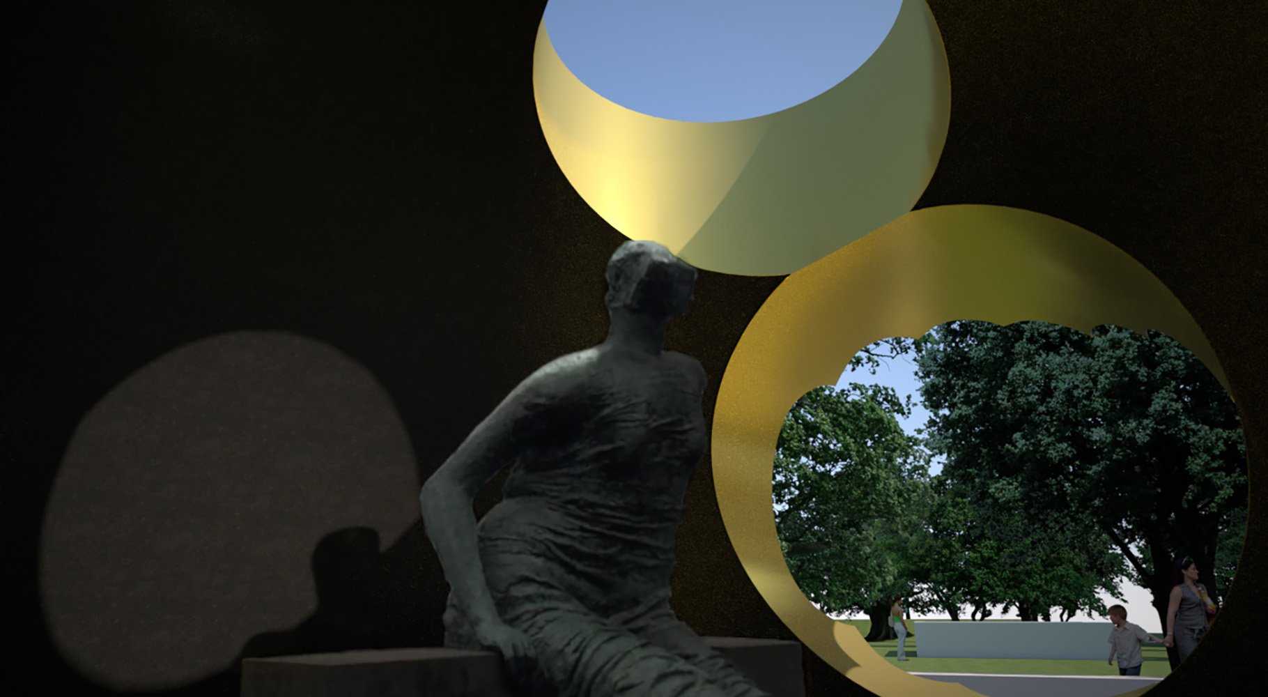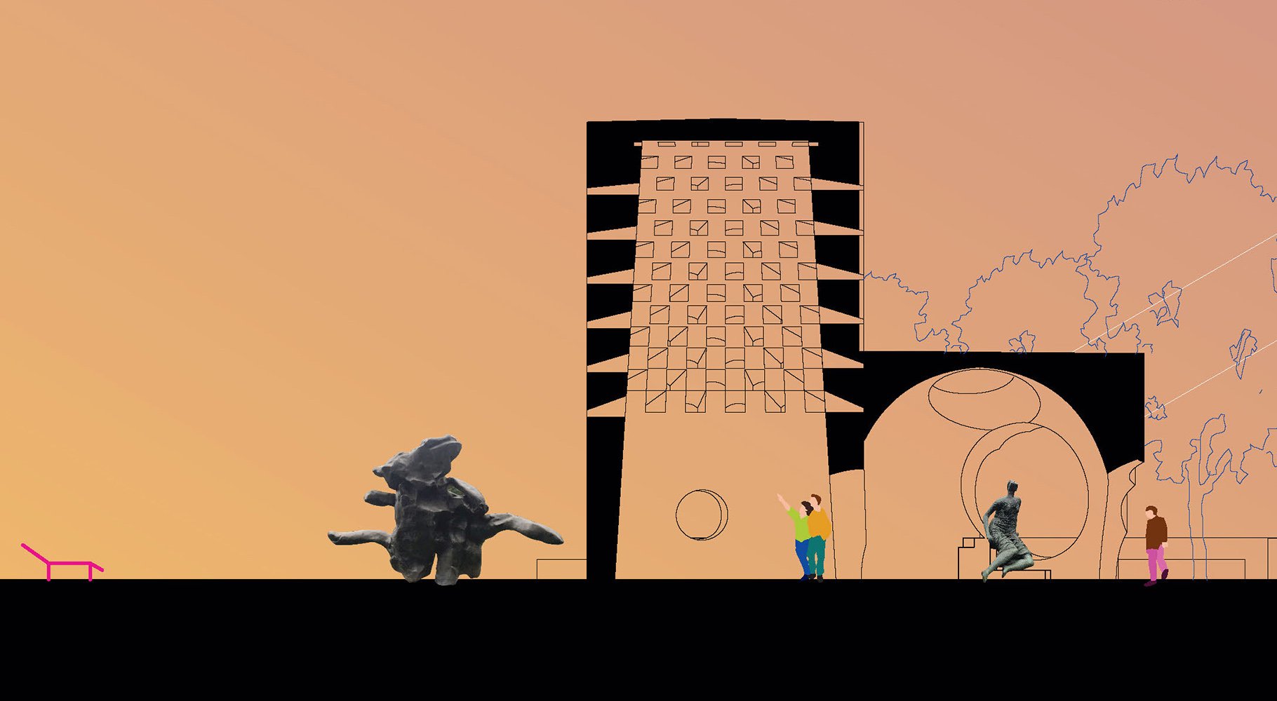 The project conceptualised the search for Gold in two intersecting volumes. The first is a 7m x 7m x 5m tall volume with a black colour spherical inner chamber that embraced the Henry Moore’s Draped seated woman. This volume has two apertures. One, on the roof acting as an oculus. It focuses the intense summer sun across the chamber tracing time. The second aperture provides a view from the Garden restaurant to the sculpture engulf by a context of darkness. The second volume is a 5m x 5m x 10m tall with a tapered vertical chamber. The interior is white with an array of apertures that diminish in size to construct a false perspective. Each aperture has its sill face painted in gold, reflecting the daylight with a gold hue into the interior. When lit by the sun during the day, the gold colour saturates the interior. One aperture visually frames the Standing Figure by de Kooning. This chamber is tapered to enhance the illusion that the interior of the volume is taller than it seems from the outside; as if one has stepped into Alice’s Wonderland.