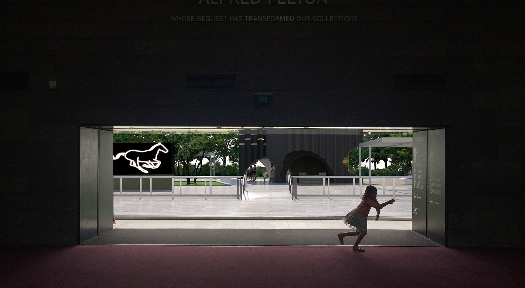 The pavilion provides two spaces with contrasting experience for audiences of NGV; each layered with a multitude of cultural and social references that can be perceived at multiple levels of engagement. It uses simple architecture language of solid and void to articulate atmosphere and frames the various pieces of sculpture in the garden into a cohesive experience. We want the audience to encounter a solid mass through the depth and thickness of the wall as well as to experience the illusion of Gold.