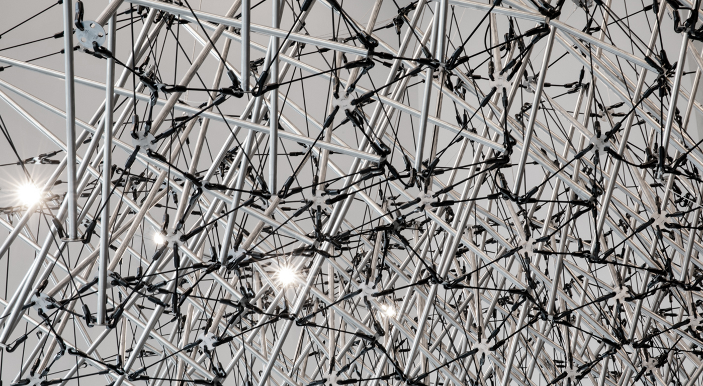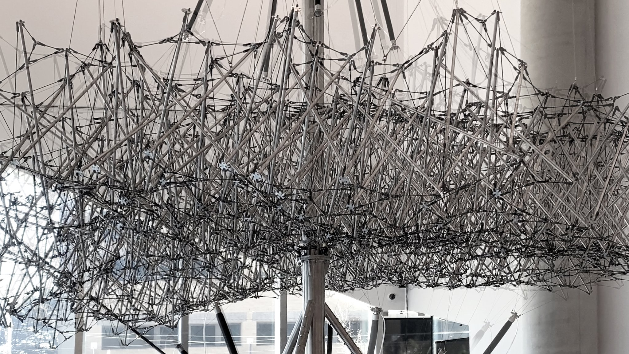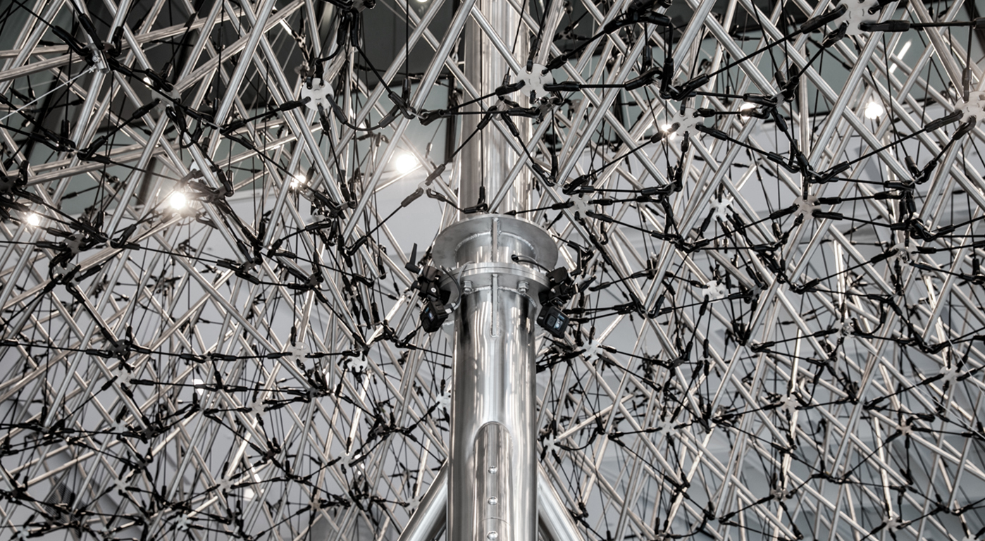 tensegrity canopy and the Anthropomorphic Machine responds with either undulating, swaying, pulsing or glitchy behaviour, generating a vocabulary of machine aliveness. Anyone, from anywhere, at