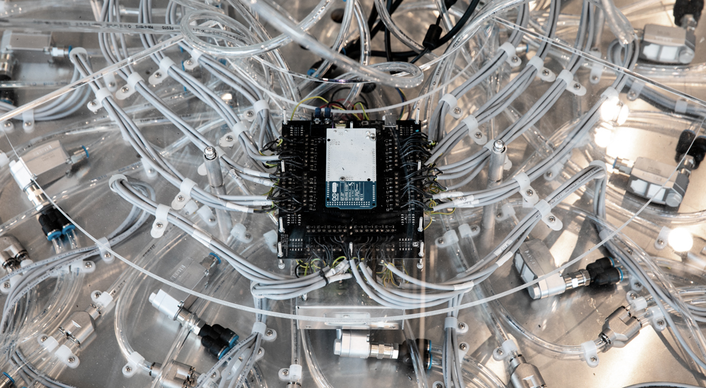 choreography that is generated by its interaction composes the compressed air sounds and solenoid clicks, immersing the audience in its acoustical landscape.